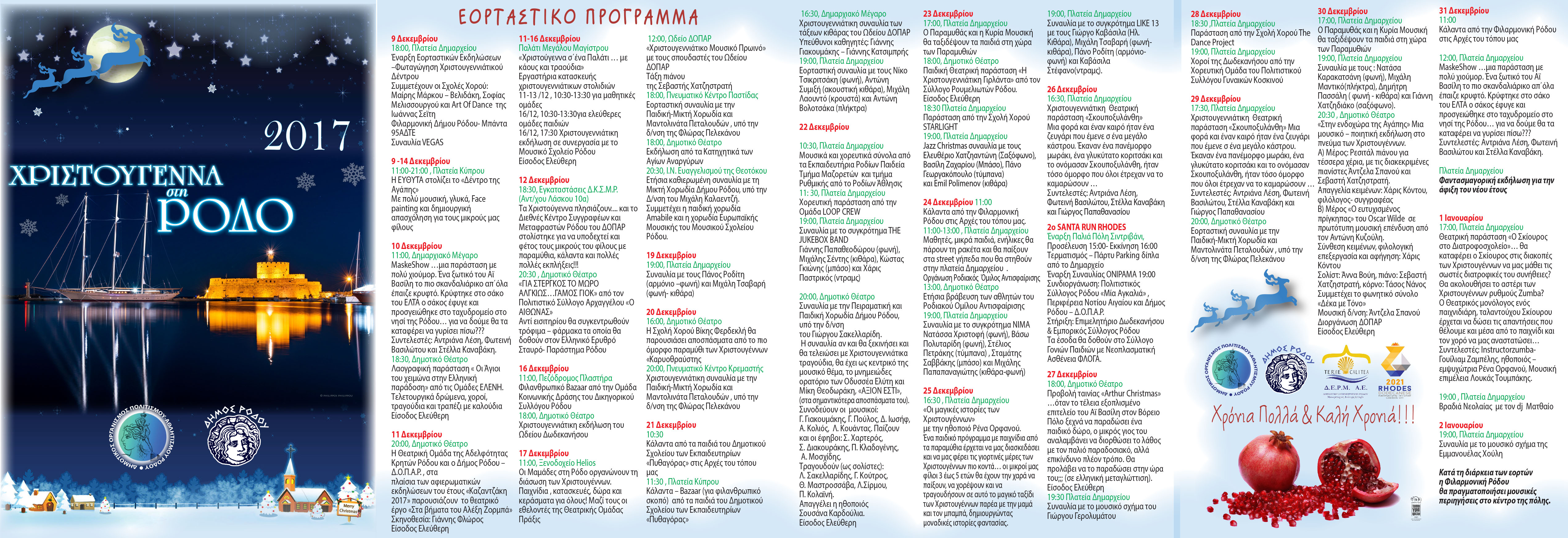 Αρκετές και ενδιαφέρουσες εκδηλώσεις θα πραγματοποιηθούν κατά την εορταστική περίοδο στον Δήμο Ρόδου. Ολόκληρο το πρόγραμμα εδώ.