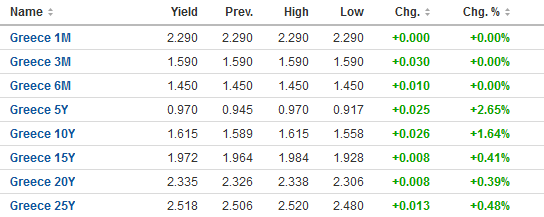 Ανοδικές τάσεις επικράτησαν σήμερα για τις αποδόσεις των ελληνικών κρατικών ομολόγων, με την απόδοση του πενταετούς να διαμορφώνεται στο 0,97% με άνοδο 2,65%, και του δεκαετούς στο 1,615% με άνοδο 1,64%.