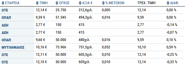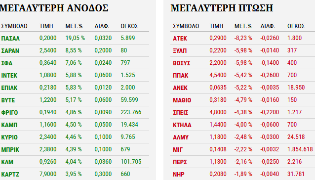 Από τις μετοχές της μεγάλης κεφαλαιοποίησης, τα μεγαλύτερα μηνιαία κέρδη πραγματοποίησε η μετοχή της Τέρνα Ενεργειακής με 7,45%, ενώ τις μεγαλύτερες εβδομαδιαίες απώλειες σημείωσε η μετοχή του Μυτιληναίου με 10,06%.